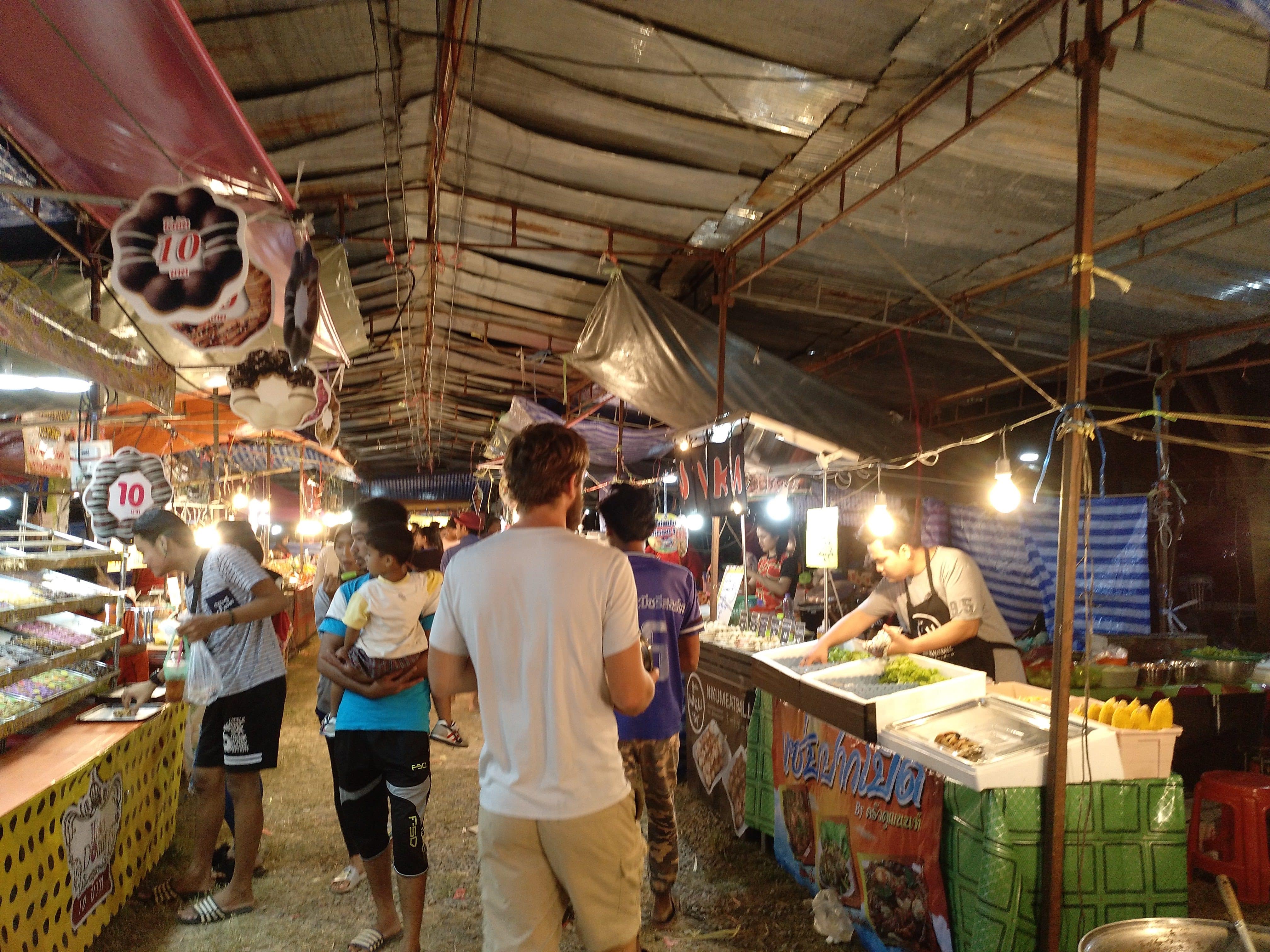 En Koh Lanta hay un mercado que se va moviendo de sitio cada semana. Cuando nosotros estuvimos estaba en el puerto de Saladan (al norte de Koh Lanta Yai) y la entrada costaba 20 bahts (0,50€). Dentro, entre otras cosas, había un montón de puestos de comida variada muy barata, incluido uno de grillos y otros insectos fritos que no nos atrevimos a probar. No es un mercado orientado a turistas así que la mayoría de la gente que había allí eran población local.