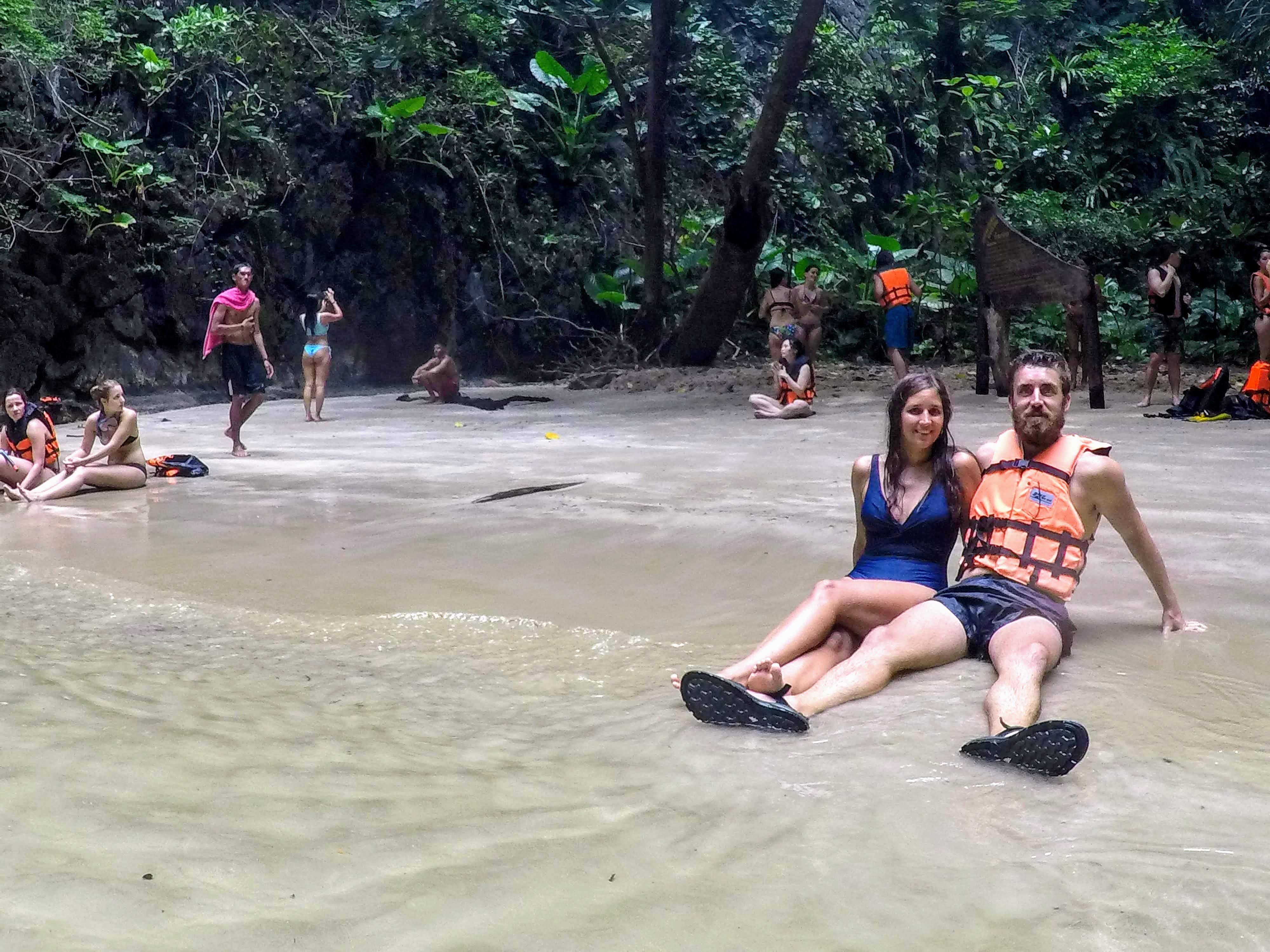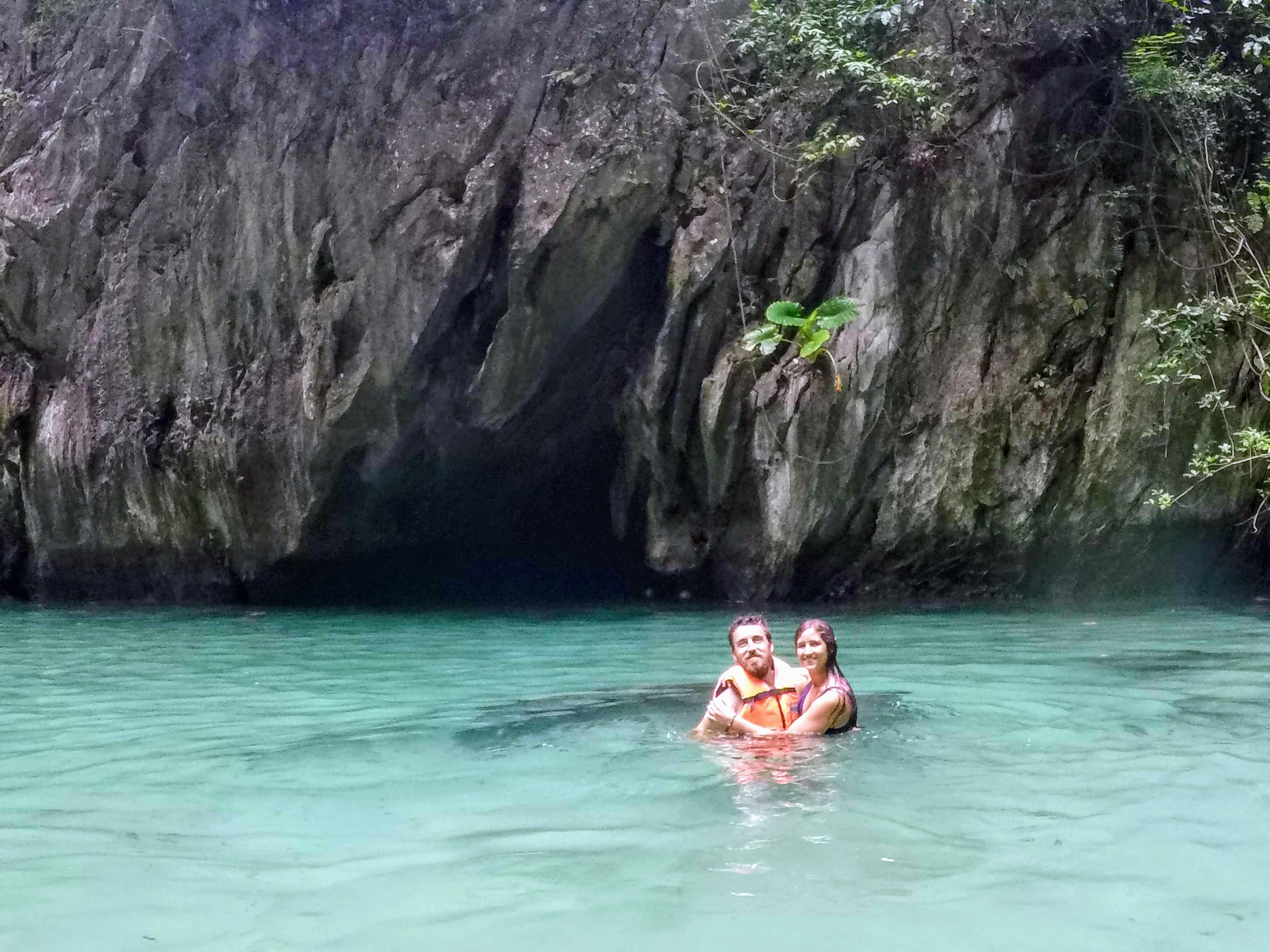 Para llegar hasta ella hay que atravesar nadando la Cueva Esmeralda de unos 90 metros de largo. En la cueva no entra la luz, por lo que los guías te acompañan con linternas y te van mostrando el interior. Nosotros que somos muy dados a ir a los sitios por nuestra cuenta, comentamos que nos habría dado un poco de miedo hacer este tramo solos.