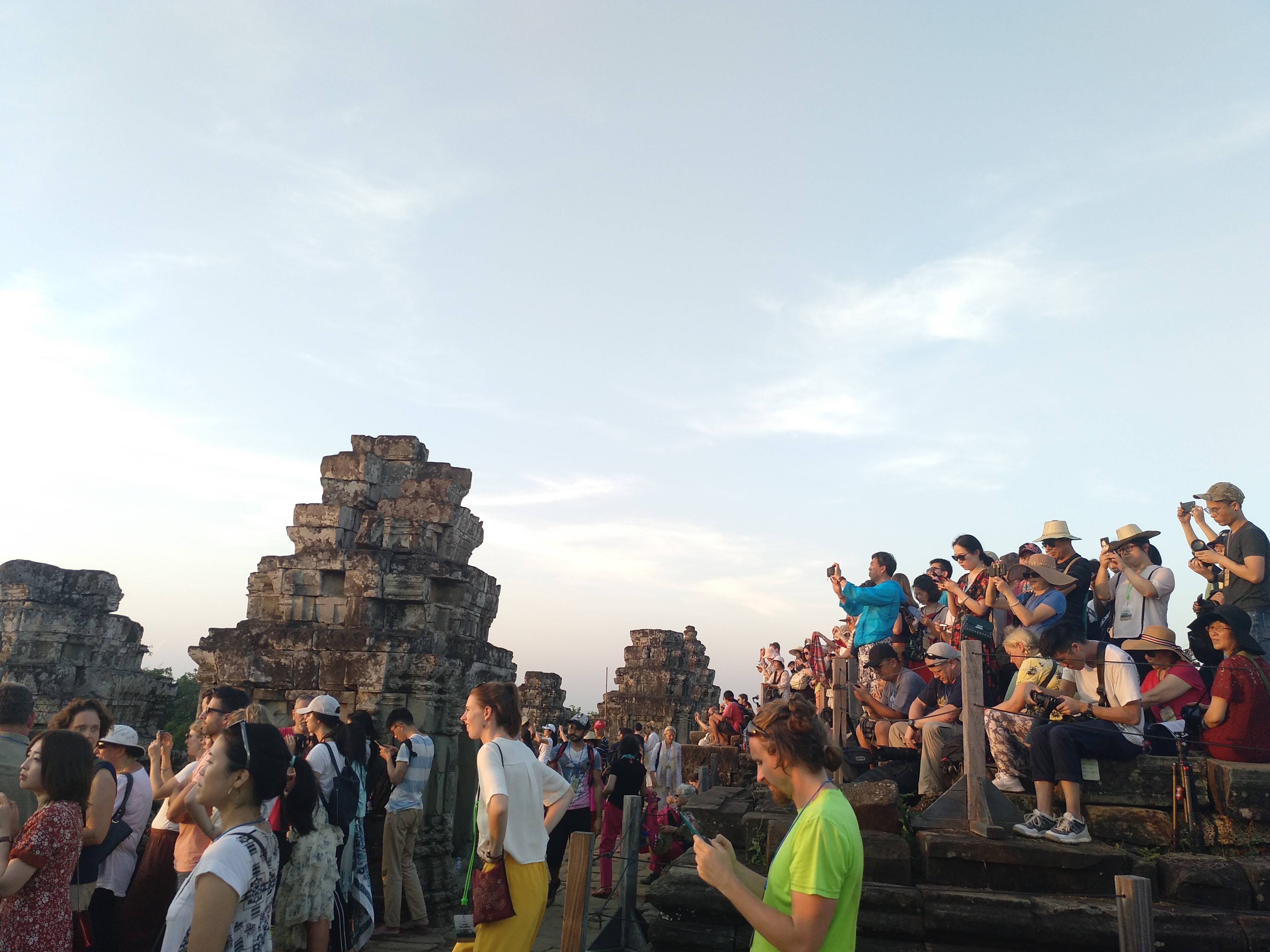 Subimos al templo a las 16:30 porque solo dejan subir a 200 personas y se forma una cola larguísima para acceder. Allí nos tocó esperar una hora sentados en un huequito de sombra. A las 17:30 el sol empieza a bajar y todos los turistas empiezan a comportarse como si fuera la primera vez en su vida que ven un atardecer.