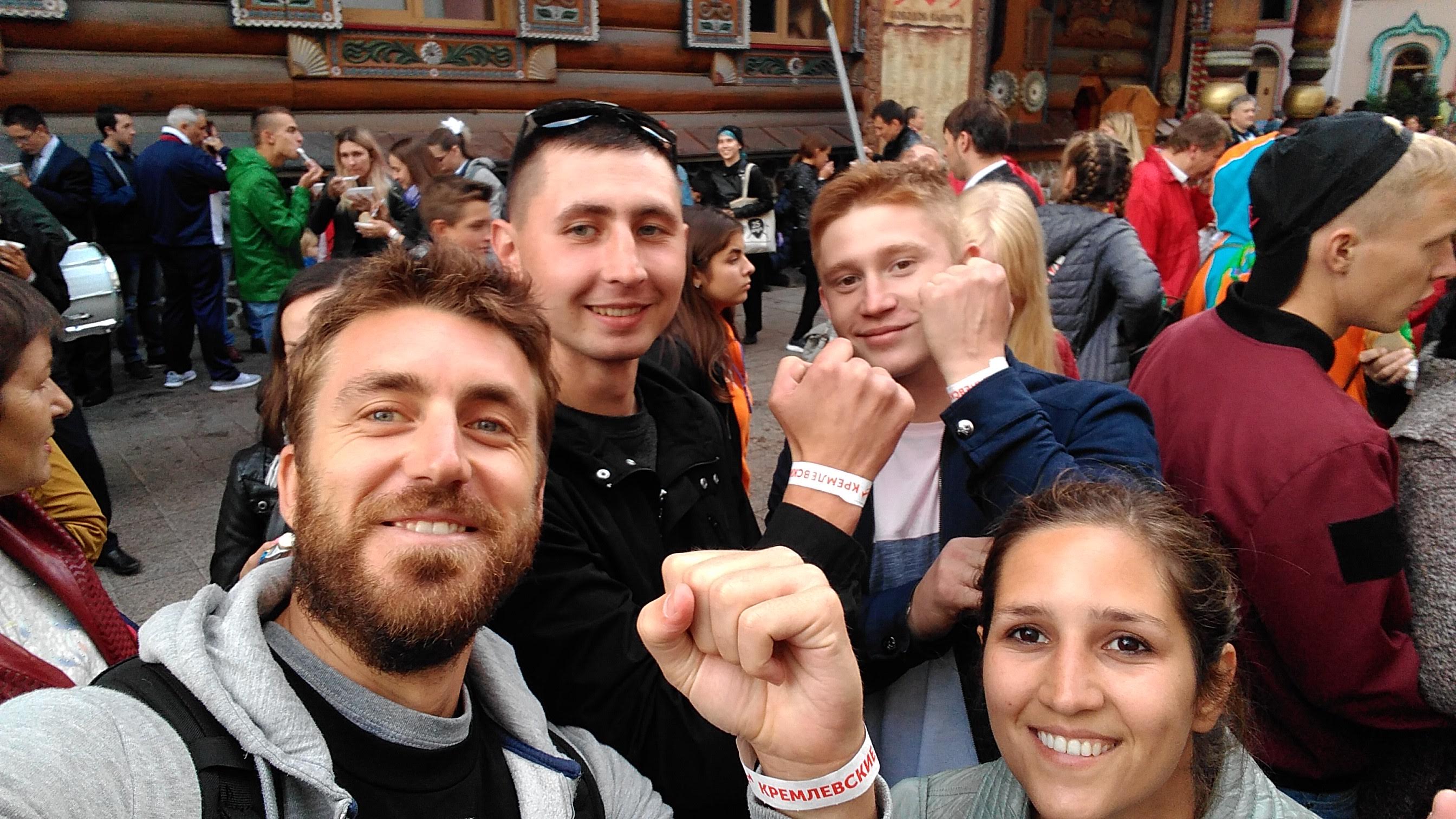 Había muchos niños vestidos de uniforme simulando la victoria de la URSS en la Gran Guerra Patria que para los rusos es la II Guerra Mundial. Llamaban la atención dos tanques de guerra en medio de la calle desde los que varios voluntarios repartían comida gratis a los miembros de las orquestas y a los militares que habían ido a desfilar.