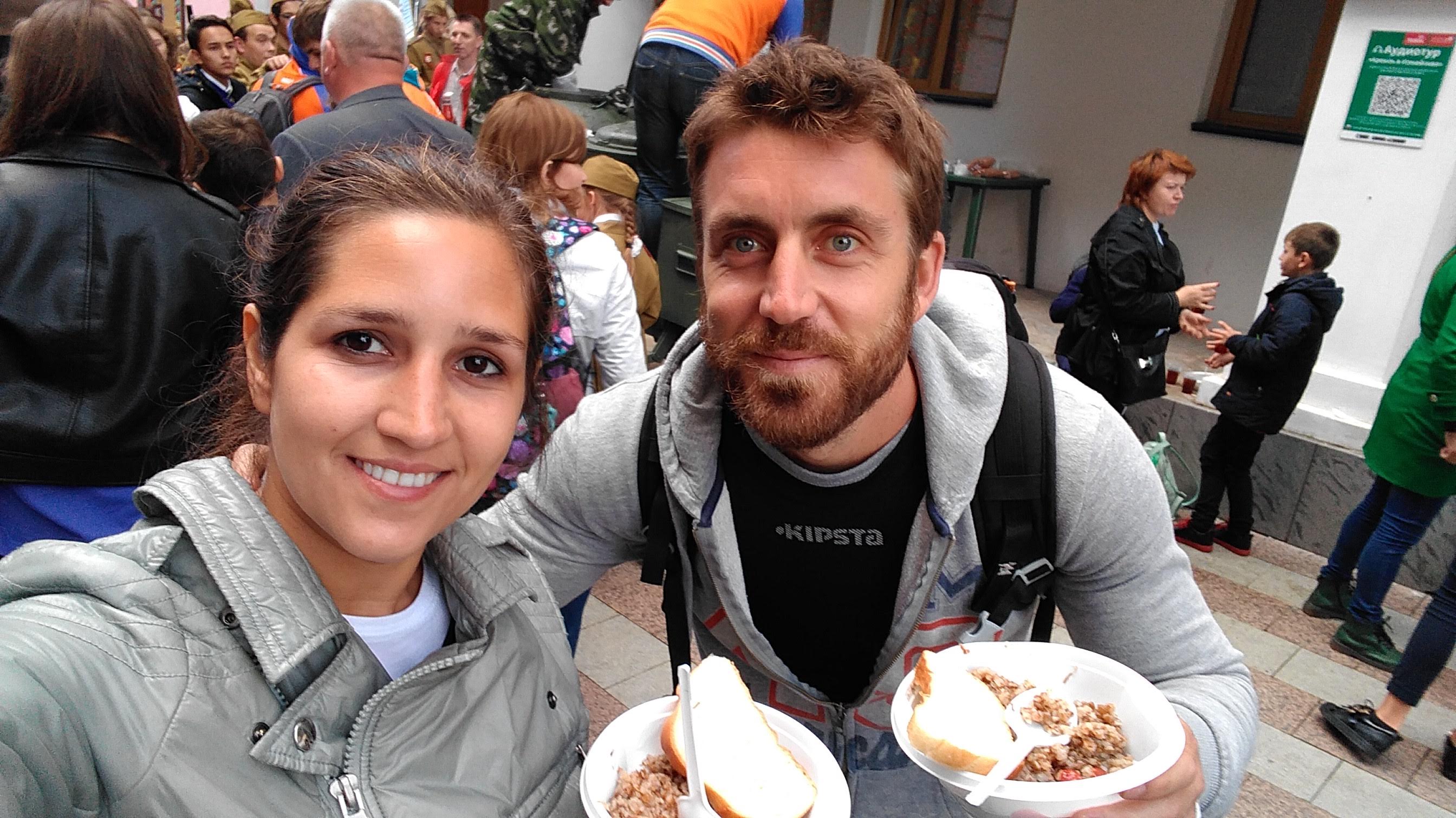 Nosotros no sabíamos bien a qué se debía todo ese despliegue y nos acercamos a preguntar. En seguida nos pusimos a hablar en inglés con unos militares rusos súper simpáticos que nos terminaron invitando a comer de uno de los tanques. Cuando nos quisimos dar cuenta, estábamos comiendo una comida típica rusa (gratis, por cierto) al solecito y con una compañía estupenda. Fue una experiencia única. Por cosas como esta, merece la pena viajar.